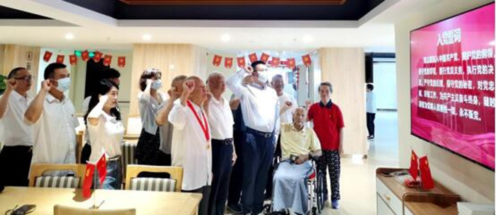康養(yǎng)黨支部邀請(qǐng)康養(yǎng)中心入住老人積極參加活動(dòng),并為11位在場(chǎng)的老黨員同志佩戴黨徽,共同重溫入黨誓詞,在這些已經(jīng)完成過(guò)無(wú)數(shù)次的儀式中,老黨員們?cè)賾洺跣氖姑俅胃惺艿近h員身份帶來(lái)的驕傲與責(zé)任。