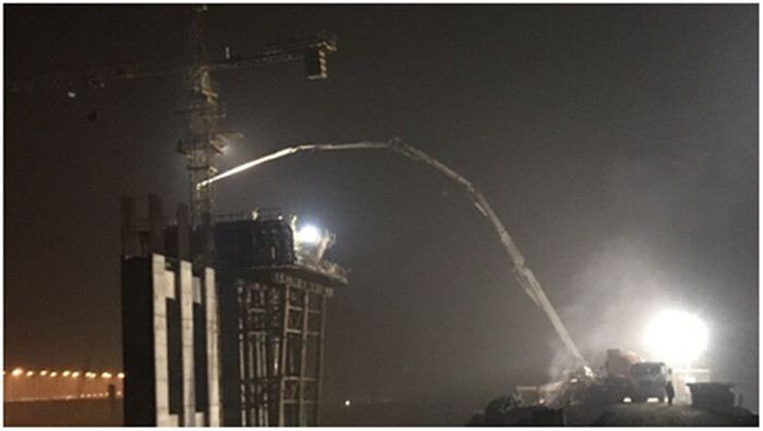 當晚23點47分,隨著高壓混凝土輸送泵最后一泵混凝土輸送至26米的高空,府河特大橋1#墩左幅1#塊懸澆箱梁完成。此工期節點的順利完成也標志著府河特大橋上部構造施工取得了階段性勝利,為下一步懸臂掛籃施工的順利開展打下了堅實的基礎。