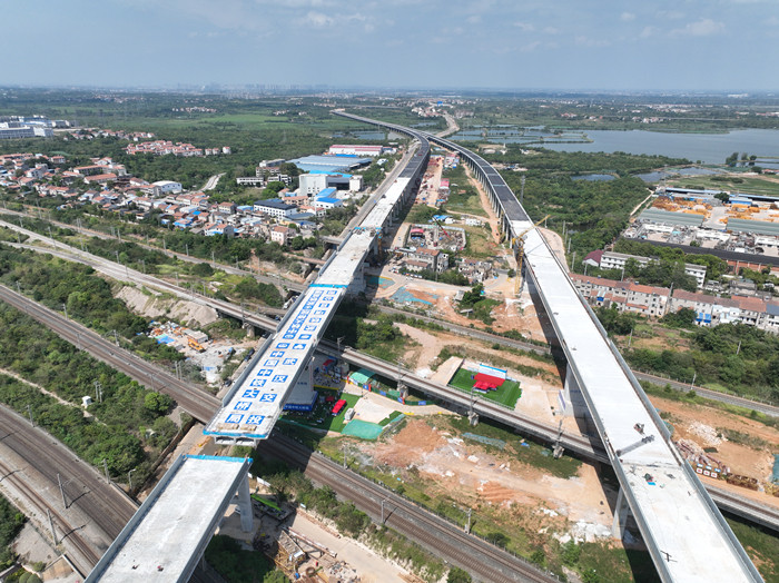 武大高速跨鐵路立交橋跨越京廣鐵路上下行客運線及貨運線、武漢北編組站、新港上行線等9條既有鐵路營業(yè)線。