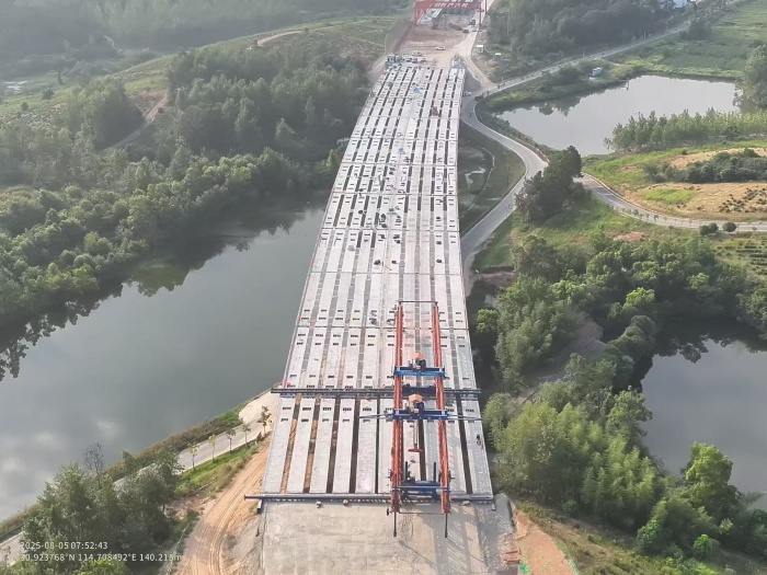 該橋位于武漢市新洲區鳳凰鎮毛家沖村,橫跨毛家沖水庫,全長337米,設計為3聯11跨,施工中嚴格采用預應力后張法先簡支后連續的先進箱梁施工工藝,項目團隊克服技術難點,高效完成了全部110榀箱梁的預制、運輸及架設任務。