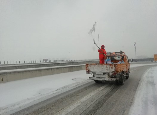 “雪情就是命令”!養護單位接收到指令后,立即啟動除雪保暢應急預案,迅速投入人力、物力開展除雪保暢工作。組織人員有針對性的對特大橋梁、彎道長上下坡進行重點巡查,了解路面、橋梁積雪厚度。隨著降雪范圍及雪量增大,為防止路面結冰,養護單位在下雪初期進行小劑量融雪劑撒布。撒布車、鏟雪車不間斷進行除雪保暢作業,做到人歇機不歇,全力確保轄區道路安全、暢通。