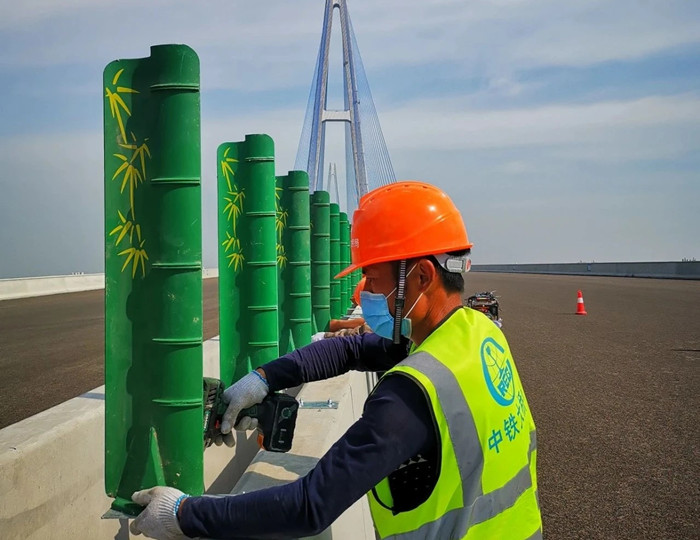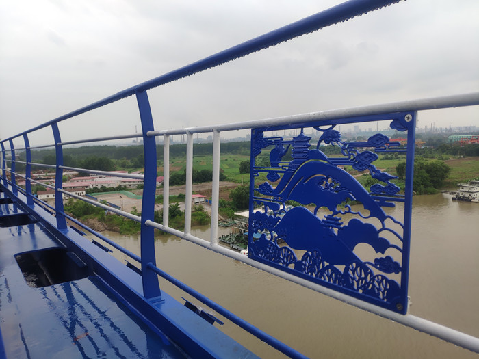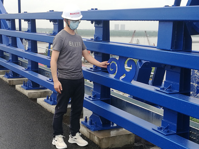 在“世界級尺度”之外,青山橋還有諸多細(xì)節(jié)之美。邊側(cè)防撞護(hù)欄每四節(jié)增設(shè)一塊浪花造型的裝飾板,為鋼筋鐵骨添了幾分靈動;外側(cè)欄桿上加入黃鶴樓等造型,與江城各地標(biāo)建筑遙相呼應(yīng);橋面中間的隔離欄上加裝綠色竹節(jié)造型的防眩板,既醒目又清新……觀者賞心悅目之余,不禁贊嘆建設(shè)者的用心與巧思。