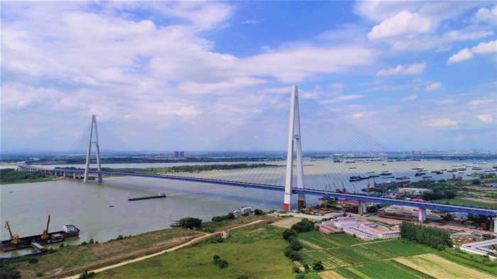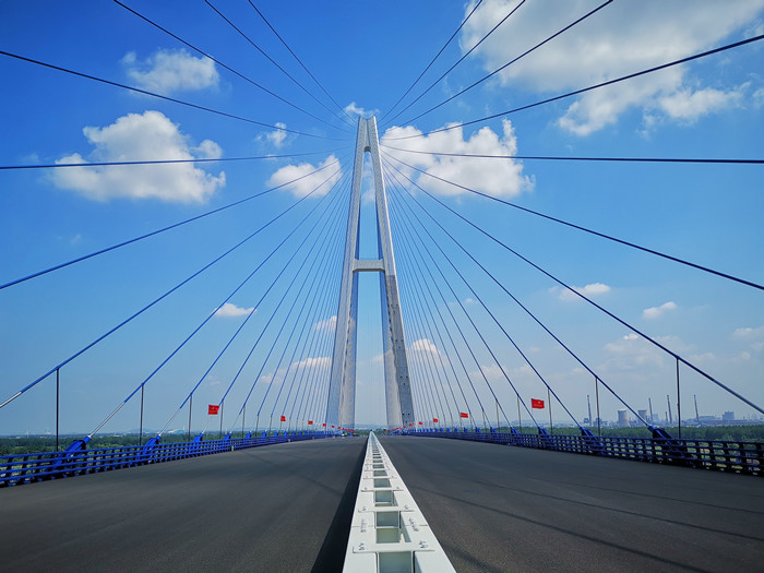 看青山橋,須晴日,當(dāng)遠(yuǎn)觀。兩座云白色的橋塔直沖云霄,與朵朵白云相映襯,撐起南北兩岸巨傘般的252根天藍(lán)色斜拉索,與上下游的青山綠水交相輝映,構(gòu)成長江主軸上一幅水天一色的美景。