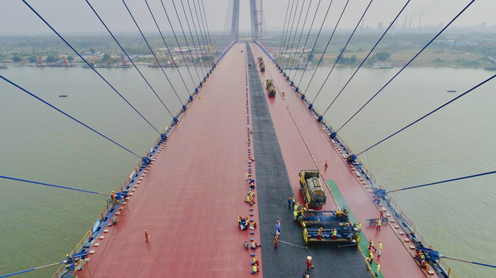2019 年 11 月 23 日,主橋?yàn)r青面層完成,標(biāo)志二期路面施工完成。