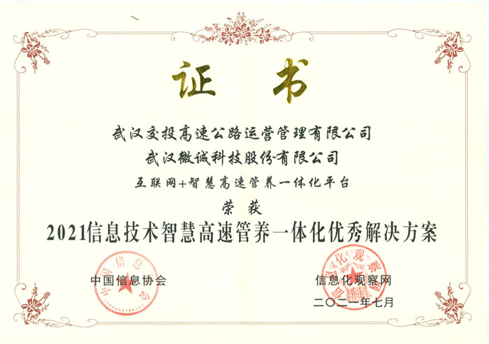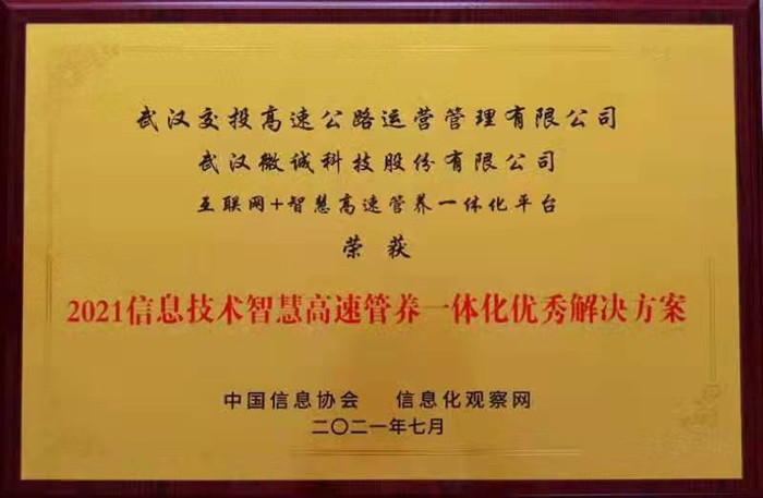 近日,由中國(guó)信息協(xié)會(huì)主辦“2021第四屆中國(guó)信息技術(shù)主管大會(huì)”在北京圓滿召開。武漢交投集團(tuán)高速公路運(yùn)營(yíng)公司“互聯(lián)網(wǎng)+智慧高速管養(yǎng)一體化平臺(tái)”獲得大會(huì)授予的“2021信息技術(shù)智慧高速管養(yǎng)一體化優(yōu)秀解決方案”榮譽(yù)稱號(hào)。這也是武漢交投集團(tuán)高速公路智慧管養(yǎng)一體化平臺(tái)代表湖北高速公路系統(tǒng)斬獲的全國(guó)性大獎(jiǎng)。