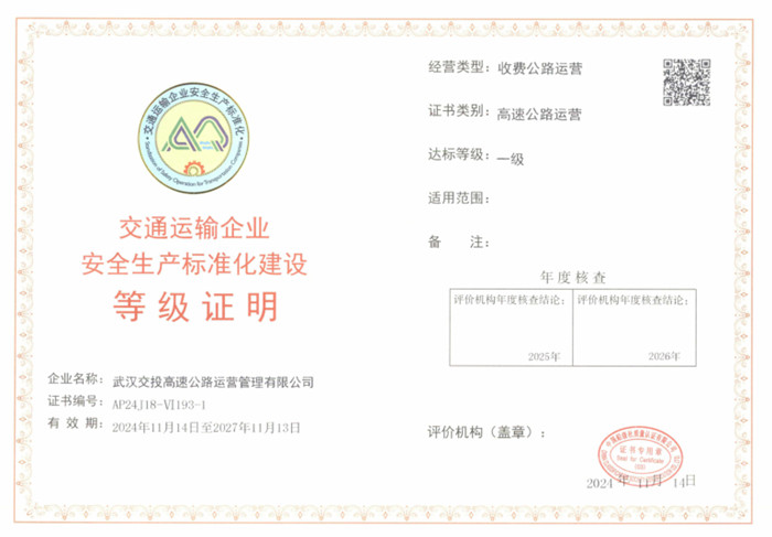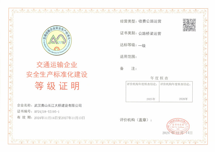 近日,交投集團青山長江大橋公司、高速公路運營公司雙雙通過交通運輸企業(yè)安全生產(chǎn)標準化達標認證考核,喜獲“交通運輸企業(yè)安全生產(chǎn)標準化建設(shè)等級一級證書”,標志著集團安全生產(chǎn)管理“標準化、規(guī)范化、精細化”管理邁上新臺階。