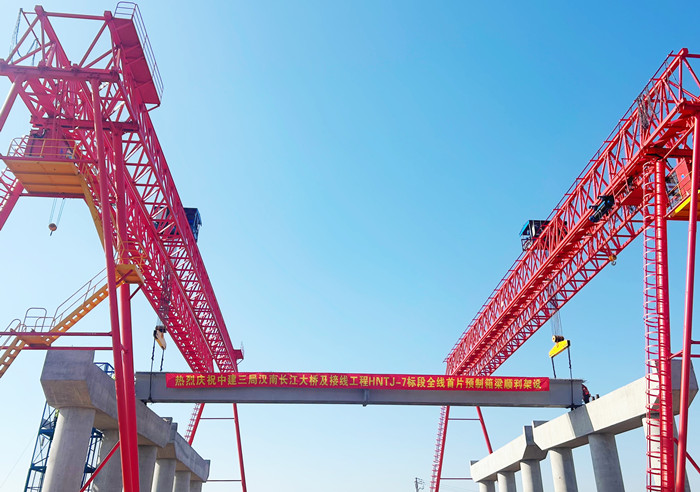 負責本次箱梁架設任務的是HNTJ-7標段,施工線路全長約11.845公里,橋梁占比100%,共設計預制箱梁5135片,全部由項目智慧梁場預制。項目全線首個智慧梁場占地約210畝,場內設置10條智能生產線,配備40個移動臺座、達產后可以達到“日產8片梁”高效運轉的目標。本次箱梁的成功架設,為全線大干快上奠定了堅實基礎,助推項目建設跑出“加速度”。