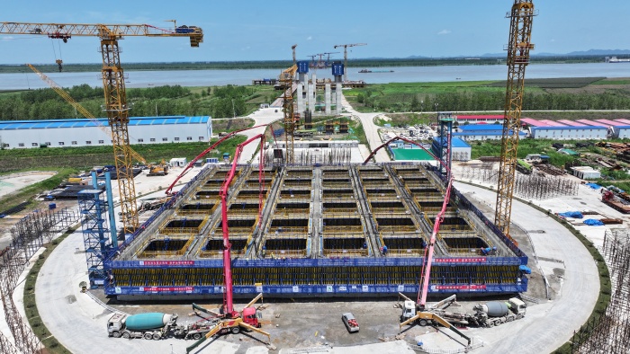 作為大橋的“定海神針”,錨碇承擔著拉住主纜的關鍵作用。漢南長江大橋的錨碇沉井規模巨大,其基礎平面尺寸達76.4米×76.4米,面積約5837平方米,相當于14個標準籃球場大小,被譽為公路工程世界第一大沉井。沉井總高43米,將分8節澆筑成型。此次南岸沉井完成了第五節(高度4.5米)的混凝土澆筑,澆筑量約7650立方米。